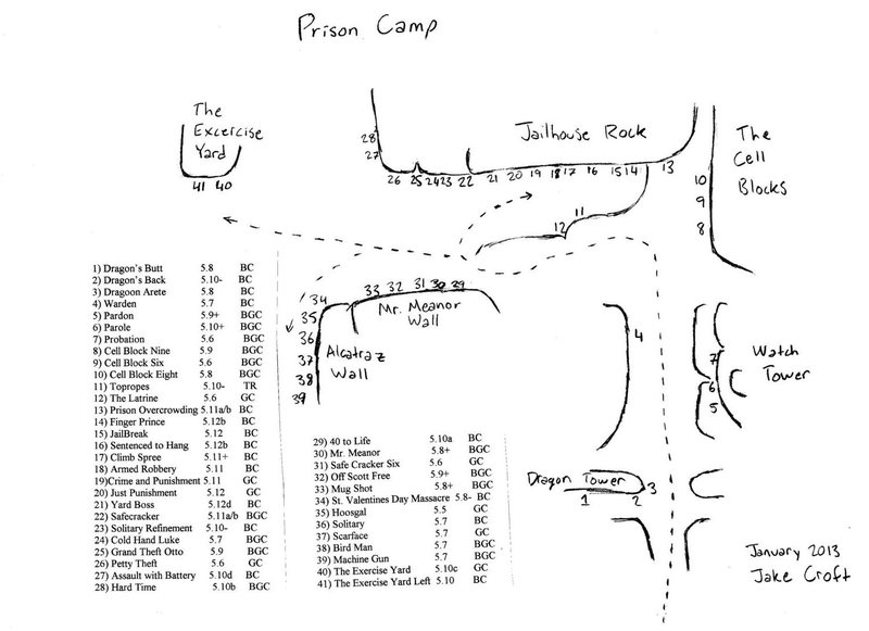 - Jailhouse Rock: Prison Camp's premier wall features harder lines on water-polished rock. Standout routes include Crime And Punishment, Armed Robbery, and Sentenced To Hang. There are a number of easier, mostly mixed lines around the corner and to the left.