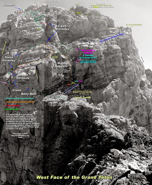 If you have never climbed the Grand Teton before, I recommend purchasing the short pamphlet guide at the ranger station. This contains a photo of the west side of the summit, which is invaluable during the descent. Chances are there will be many people on the descent and you can simply follow the crowd. However if it is off-season I wouldn't count on following everyone else.