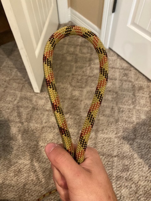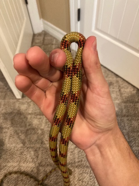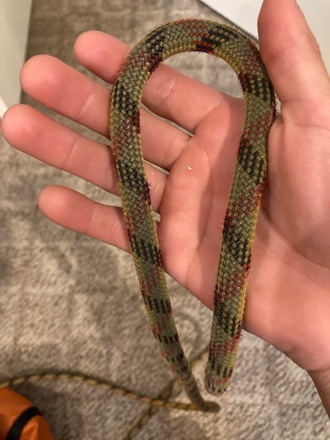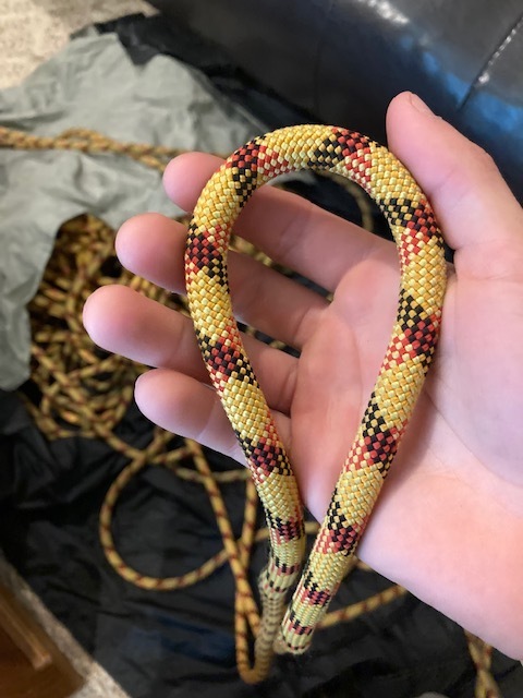 So I am a student at a local University and we have a couple lead ropes that I was going through yesterday, the reason being is because we have an upcoming trip that we put together ourselves (the school is not involved) and we are planning on bringing my two ropes plus the two ropes from the school. We are allowed to use them and our group of 10ish is the only people that ever uses lead ropes. Anyways we have 2 60m ropes that we are bringing from the school one of them is brand new bought recently while the other is from 2013. The person that used it before was nice enough to put a tag on the rope detailing when it was first used which was Fall 2013 and it is a Beal rope. By the looks we know that the rope has not been used very much because these two 60m ropes are reserved for outdoor climbing only and the last time the school had a sponsored trip to climb outside was around 2013-2016 and I am sure that it was mainly used for top roping. However, inspecting the rope on one end there is a long black streak where it looks like the rope has been rubbed on? This continues for ~20ft. Other than that there is no visible damage to the rope and it has been stored in a cabinet with another rope away from harmful substances. I wasn't able to find any soft spots or voids in the rope after inspecting it over and over. So my question here is what do you guys think about the safety of this rope and is it ok to lead on? My plan was to cut of the ends where the black streak is and continue to use it? But I do have some doubts about the age of the rope mainly because I have little experience seeing what a really bad rope looks like and what a ok to use rope looks like and where to draw that line between the two. But I also feel that this rope is still fine seeing that the rest of the rope looks very clean and unused. This spot is about a 1ft away from where the black streak ends. |