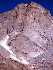 The climbs start part-way up the face. They are accessed by hiking up the snow chute on the left (a little steep) or by cutting up and across from the right on a 3rd-4th class ramp which is a spicy in a couple spots (we roped up for part of it).