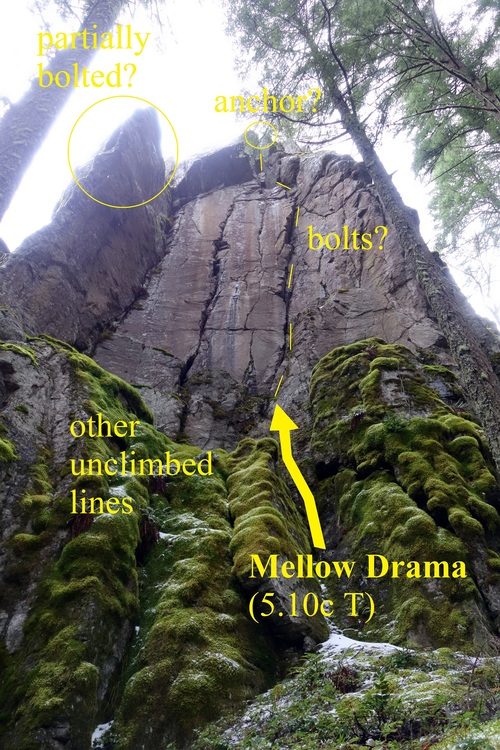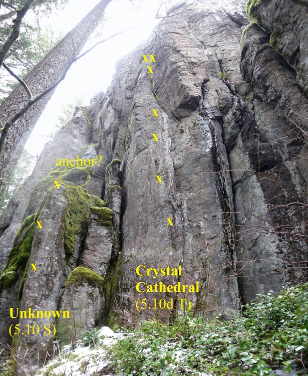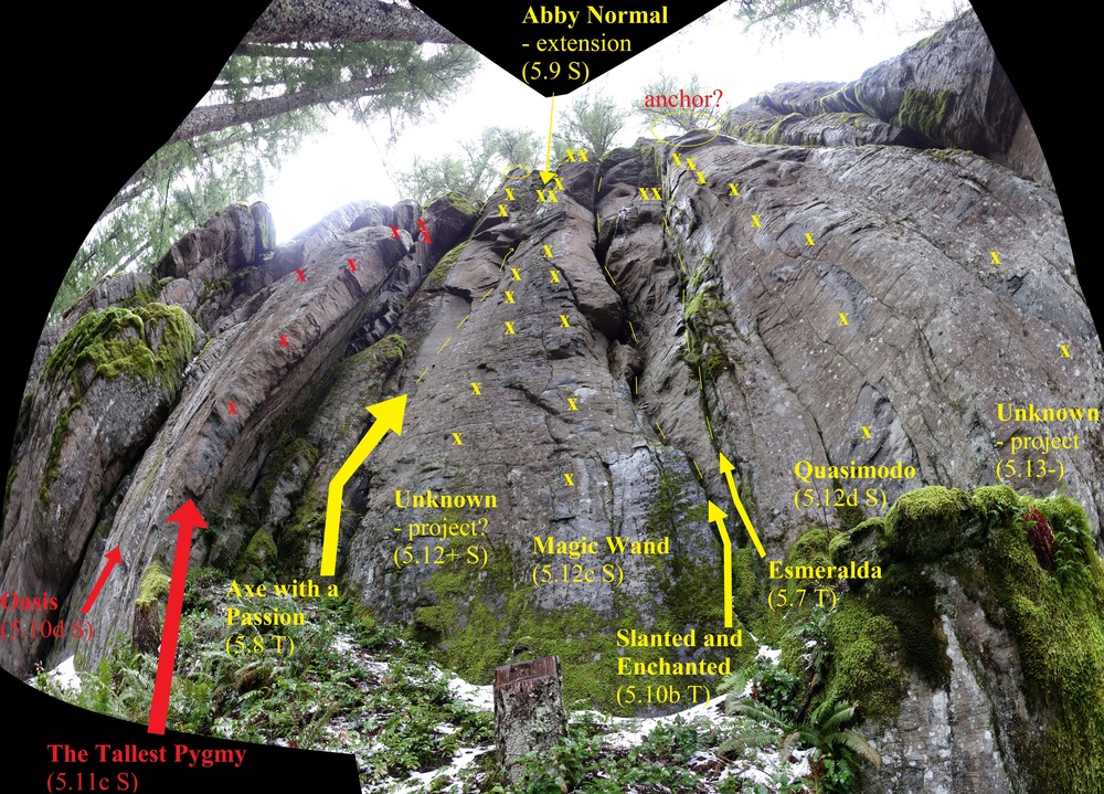 This is a crag of approachable extremes. The hike is what it is: ~25 minutes of steep uphill schlepping on a very obvious, well-maintained trail (once you find it). The cracks go at generally moderate grades, though some bow out into uncomfortably-wide territory, while the face climbs start at the high end of "moderate" and progress immediately to the "extreme" end (think Broughton's Bat Wall at elevation with different features). A plethora of development opportunities remain which will involve a lot of moss scrubbing and/or hard-ass face climbing. What's already established presents at least a few days worth of fun to justify the hike. Supposing some intrepid developers were to fill in the obvious lines that remain, including the upper tier, and we'd have ourselves a veritable destination crag without the obnoxious crowds.