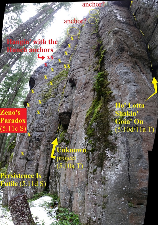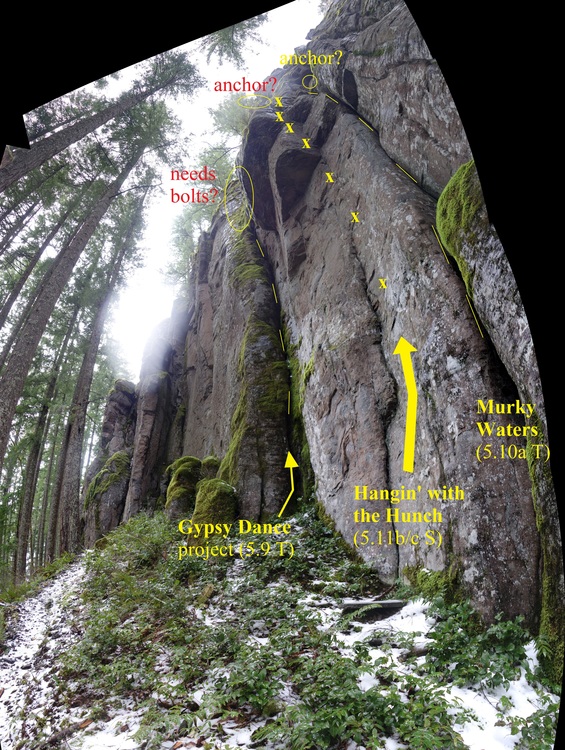 What is it that has kept this beautiful crag off the map for so long? Maybe it's the arduous approach hike. Maybe it's the lack of concentrated development. Maybe it's the absence from popular local guidebooks. Whatever the reasons may be, disregard them, as the Hunch is definitely worthy of exploration and could definitely use some traffic to keep clean / re-clean / continue cleaning routes.