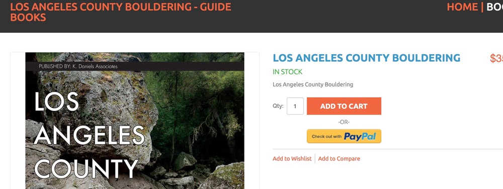 FYI: The preorder for LA County Bouldering is up on the K Daniels Publishing website. They estimate a shipping date of Dec 18th. https://kdanielspublishing.com/cart/index.php/guide-books/los-angeles-county-bouldering.html |