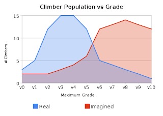 Anon Anon wrote: When learning how to set climbing routes in gyms, setters are often told to set route difficulties according to a "bell curve". An example of this is mentioned on this page. I've talked here before about different backgrounds for approaching questions (i.e. as a physicist versus as an engineer versus as a (pragmatic) climber) usually because I want to approach something more from a engineering perspective than most climbers here. This is a case where the context indicates that the writer of the piece is doing the opposite. They aren't approaching it scientifically, they're approaching it colloquially, which is fine. They're still communicating something useful: they're communicating that there's a temptation for routesetters to want to set climbs for their own grade, when their clientele actually climbs a lot weaker than they do. The bell curve claim isn't literally talking about a specific Gaussian distribution, it's just talking about where the abilities of your typical gym customer actually lie. One of the colors in the legend on this graph from the blog post is literally labeled "imagined". I'm not sure why anyone would think this was making any sort of scientific claims. There may actually be some evidence of actually Gaussian distributions, in gym climber grades, but that's fairly irrelevant to what that blog post is talking about. |