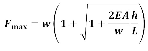 I can show you a derivation if you're interested in that too. But it comes from treating the climbing rope as an ideal spring. E is the modulus of elasticity (a material property), A is the cross-sectional area of the rope, w is the weight of the climber, h is the distance of the fall, and L is the length of rope out. You'll recognize h/L as fall factor.
