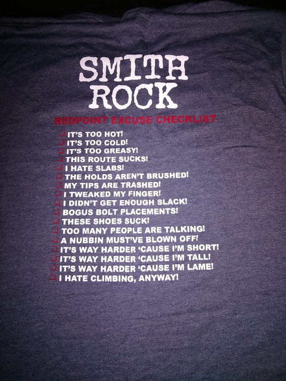 Carl Schneider wrote: I can't climb cause I'm broken I'll have to see if they will add this to the Redpoint Excuse shirt. |