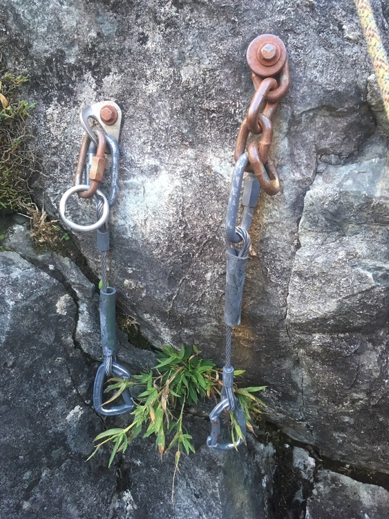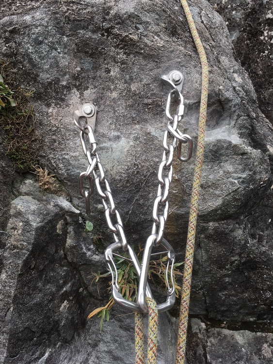 For those not familiar the bolt on the right is a washer stack on chain. Large ID fender washers against the rock, then the chain is bolted directly, with smaller ID washers stacked on top that capture the sleeve of the bolt. You would use a longer bolt over 4" since a good portion of it is now sticking out of the hole. If the sleeve rusts out severely enough there is nothing holding the cone in and eventually you could get an axial pull with the right pull. On the top anchor that's more doubtful. For anyone reading, if you want to see unsafe hardware replaced consider a donation to WARP, anything you contribute goes straight to replacement hardware costs. Info on costs at the bottom of the main page: washingtonanchors.org/ Benjamin if you've replaced bolts before just apply for a grant from WARP for these guys, no need to outlay for the hardware. You'll get stainless chain for the anchor also which is nice and can spec for lower off biners given that the feathers see so much traffic. Here's what I put on the route above, yes I know I need to get back with an angle grinder and chop off the extra links. Only so many tools I can lug out in a day ;) |