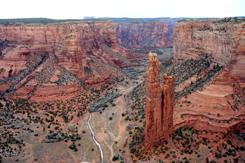 The photo in Canyon de Chelly is Spider Rock. It is in upper Canyon de Chelly near the junction with Monument Canyon. It is sacred to the Navajo and ascents are frowned upon. It was first climbed in the 60s, with the approval of the NPS and everyone found out after about the local attitude. It has been climbed surreptitiously a few times since then by people who, frankly, should rot in hell. |