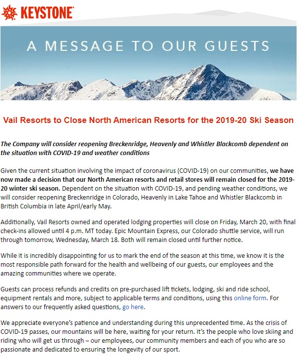 'Uphill access open at Loveland, Keystone and Breckenridge, closed at Arapahoe Basin' - Summit County News, 3/17/20 |