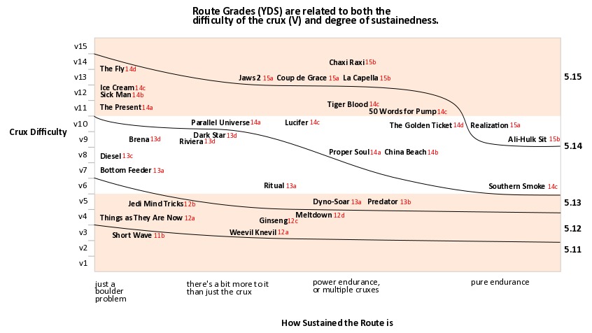 I think "the formula" works reasonably well for sport routes also, though I'd argue you might want to go something like +2.5 letter grades, on average. If you string a 5.13c into a 5.13c with minimal rest in between, you're looking at a route of at least 5.14a. There is a bit of nuance to this though, in that putting a power crux on top or an endurance problem is much harder than taking that same super powerful first move and then following up with some endurance climbing. Putting a solid V7 on top of a pumpy 5.13b with no rest in between would be 5.14 for sure, but putting a V7 at the start of an existing 5.13b probably wouldn't quite get you there, IMO. |