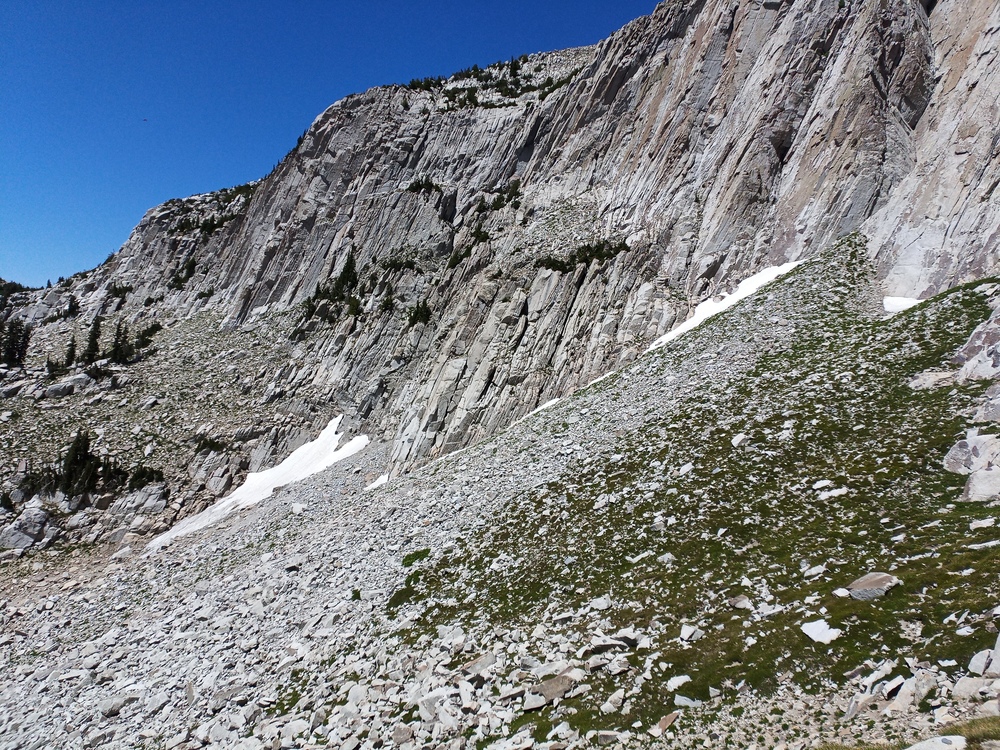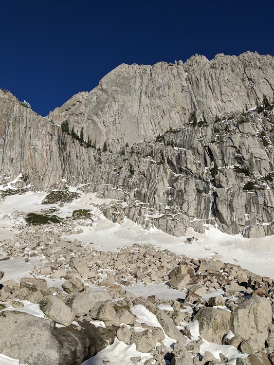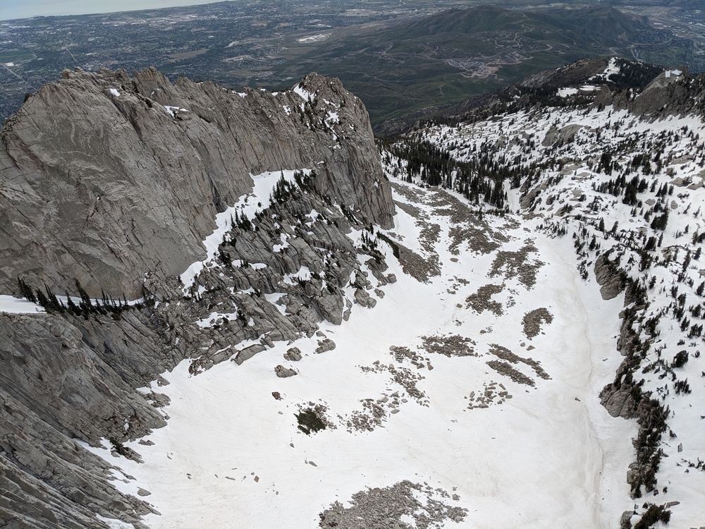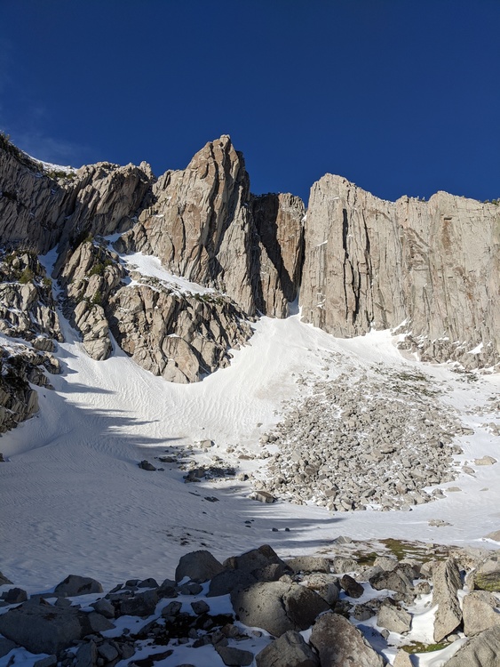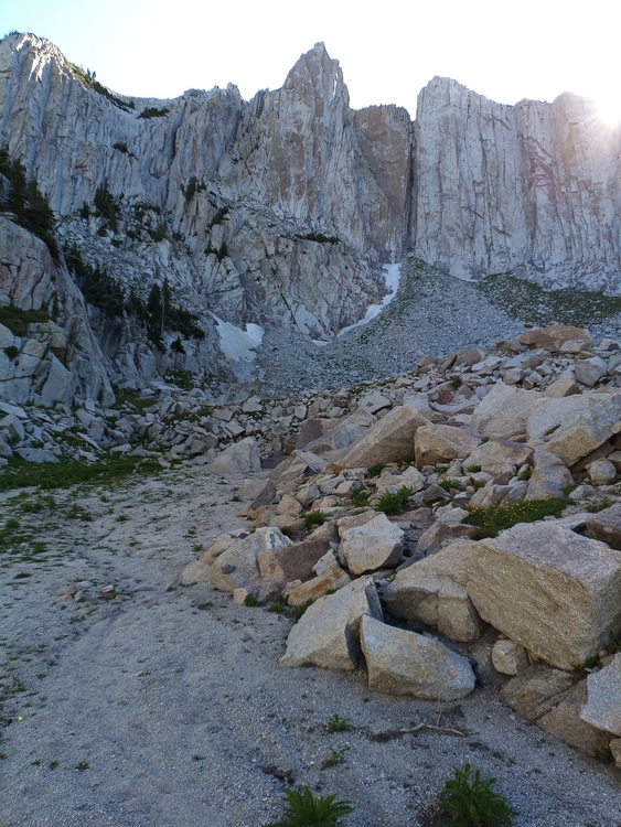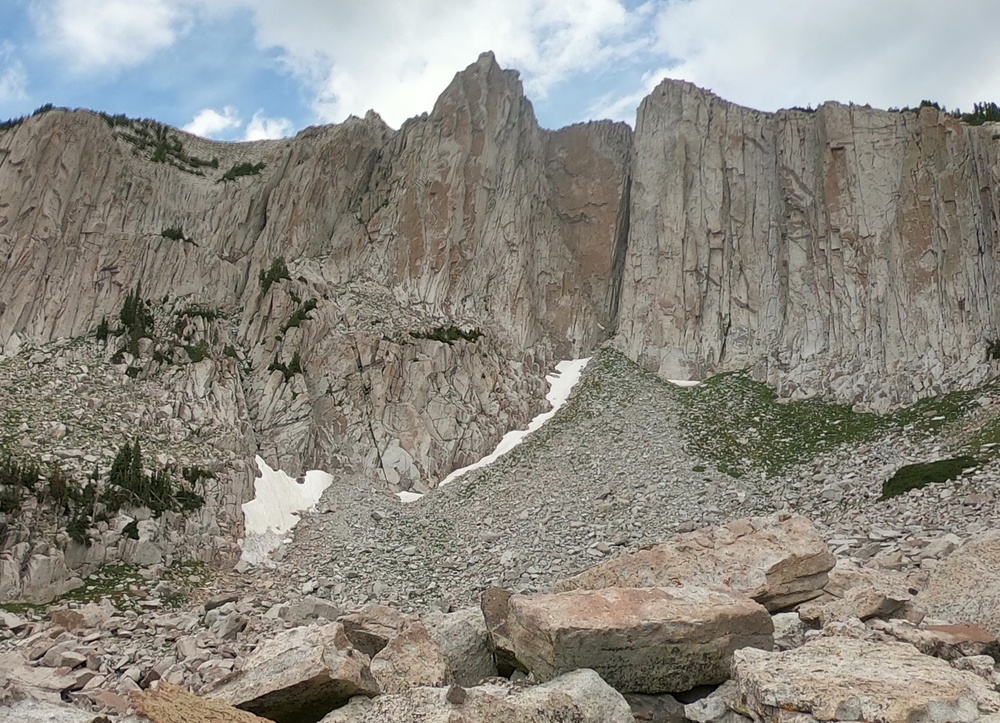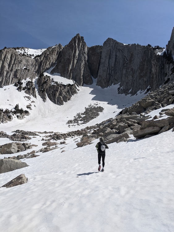 The puddles at the cowboy camp ("obvious wooden post") mentioned above are gone. At 5-6am on Tuesday, a tiny amount of water (from rain the previous evening) was running in the lower parts of the final gully up to the cirque, around ~9800+ish'. However, on our way out around 4-5pm, it was all gone and we were only able to find to two small puddles near the bottom of the gully. I fully expect these to be gone by the weekend. If you find them, take it as a blessing and I'll warn you that the lower puddle we found tasted like it had a frog decomposing in it after being filtered. With the lack of precipitation in the forecast though this weekend, I would recommend being prepared to make it all the way into the cirque via Cherry Canyon or Jacobs Ladder without finding water and having to melt snow when you arrive. We went up Cherry for the first time, cutting over to Jacobs Ladder just below Enniss... and I'll opt for that over Jacob's Ladder in the future, even once the road to Ghost Falls is reopened. Why does this approach get a bad rep? This is what was left on the afternoon of the 28th. |