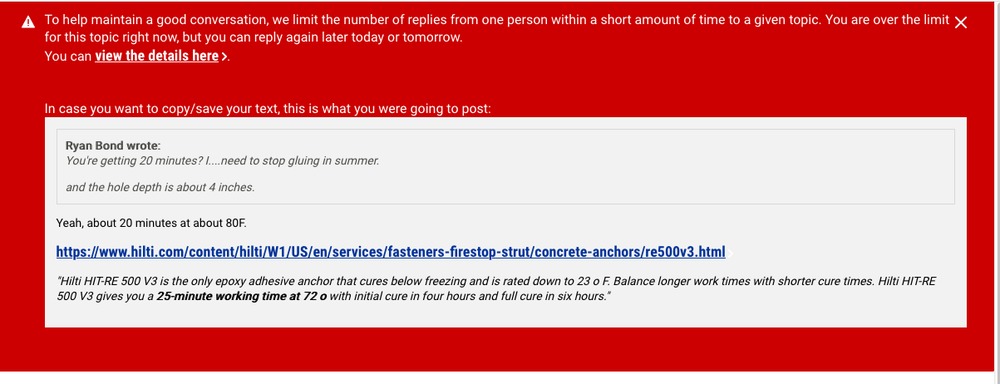 CTBwrote: Remember this is an open forum where people voice their opinions, personal experience, and learning. This can come from different angles or from different areas of expertise. The way I was told and taught bolting was to never add additional water besides what would happen naturally because it would lead to future issues including accelerating the rusting of bolts. I am not mad at the way you responded but I suggest reflecting on the initial dismissive language used, "Wholey sheep shit" and realizing not everyone knows exactly what you do. Also, this is an example of a type of micro-aggression that could have a lasting impact on a person. Though this wouldn't apply to me if you have another conversation and initially start with a strong dismissive tone try to begin with a more constructive criticism like tone such that of Trevor. |