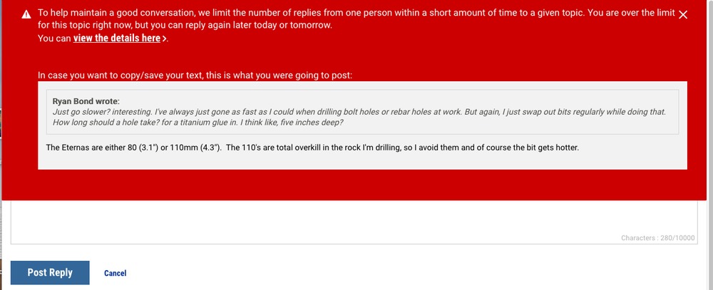 RJ Bwrote: Wholey sheep shit, that is preposterous!!! But a sloppy hole when hammer drilling is bad form, I will agree. If you’re making mud out of rock dust in the process then it will stick to the walls of the hole and your tool. Unless you hauled up some serious compressed air you will not be able to get all the mud out. So keep the water out of the rock and only use it directly on your bit, and I should have said before in my last post, its good to have a small rag or something to wipe the excess water off your bit after quenching. Keeping everything dry (but cooler) while power drilling will make things work way smoother. |