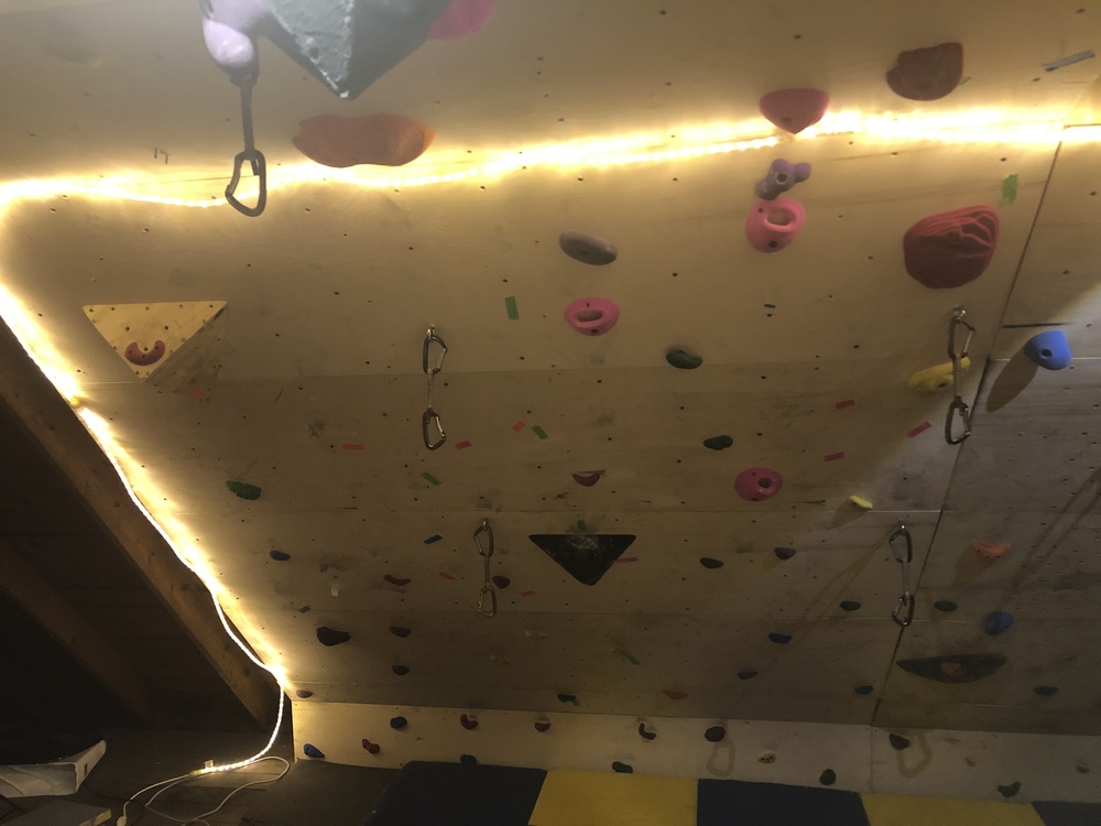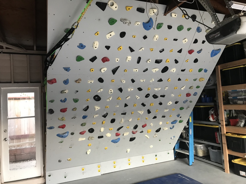 Getting some stuff set up. The 20° overhang is way harder than I expected. The big jugs and slopers really are the only things I can hang on. The good deal crimps and micro jugs will have to wait. Relearning how to keep my hips in helps. |