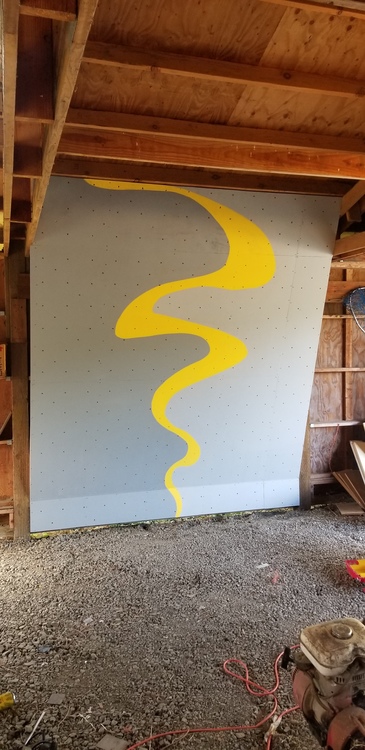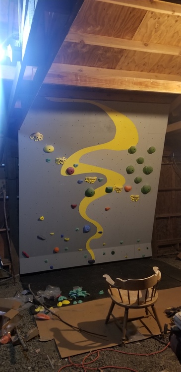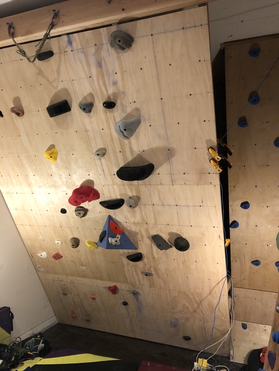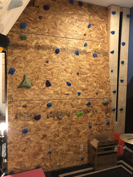 Our wall is about 80% done now(Took forever). 30° wall, 16° little section by the door, 10° Slab, and vertical section with an uneven crack. Still going to paint and texture(at the least the bottom half for smearing) the slab wall to keep from getting osb splinters. Haven’t decided if we’ll paint the pine walls yet. And I need to cut a few pieces to connect the top of the slab to the 16° section. Also for the side of the overhang(and need to make a door/wall for the storage area.) just ordered more T-nuts and 10lbs of Blem holds from escape Climbing so to make more routes and finish those last sections. Those came yesterday so I set about 7 easy routes for us to start climbing on, plus a few easy routes for my daughter to climb. Excited to make some more volumes after I get the other stuff done. We’re both pretty weak so the volumes are especially helpful for making crimps useable on the overhang. (30° and 16°) (10° and Crack) (New Comestic Blem holds from Escape Climbing) Really love the giant black and red holds from Friction, they’re the hoof jug XXL and Jurassic Jugs XXL I believe(sizes might be wrong but those are the series). Super great quality holds most of the blemishes are super minor and the holds feel great. |