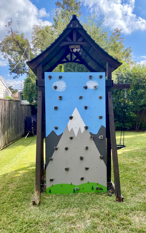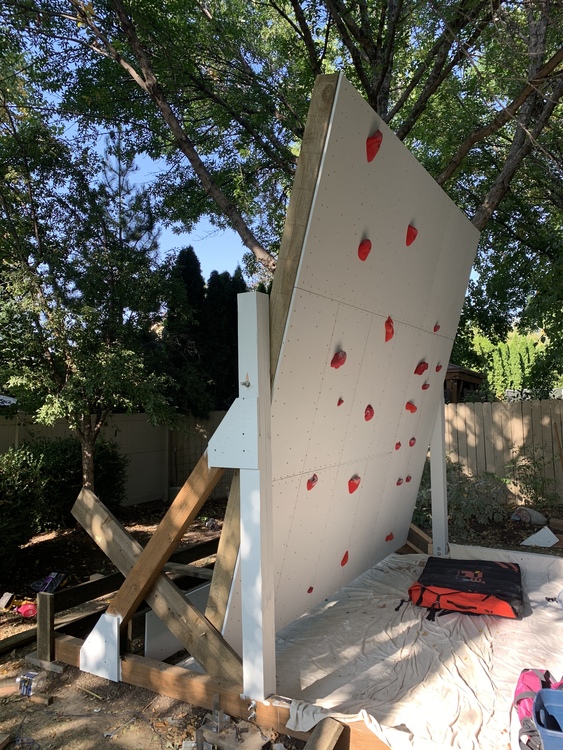 Finally finished my climbing wall this weekend. It was far more work than I imagined to create a free standing, adjustable wall. It’s been quite the journey - about 2 months from planning to completion and there are still some finishing touches I need to do. Here are the details: