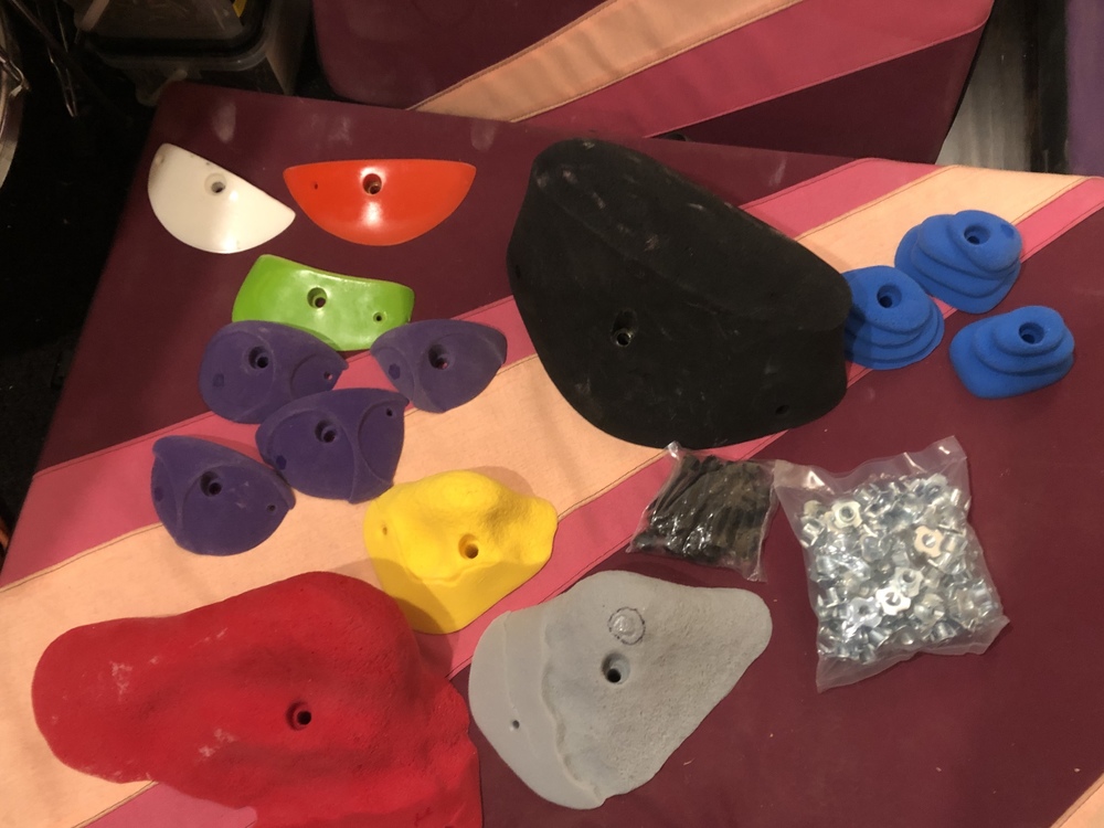 Oh the first holds we got were the So Ill bolt on 55pc bolt on stater back. They’re about $160 new. They would be good for a kid on a vertical wall. They’re mostly mini jugs/ledges and a few pinches, also matching smallish foot holds. They’re pretty hard for an overhang but my daughter easily climbs on them on the vertical and slab walls. They’re not extremely interesting or varied, but they would be perfect for a vertical kids wall and at a good price! |