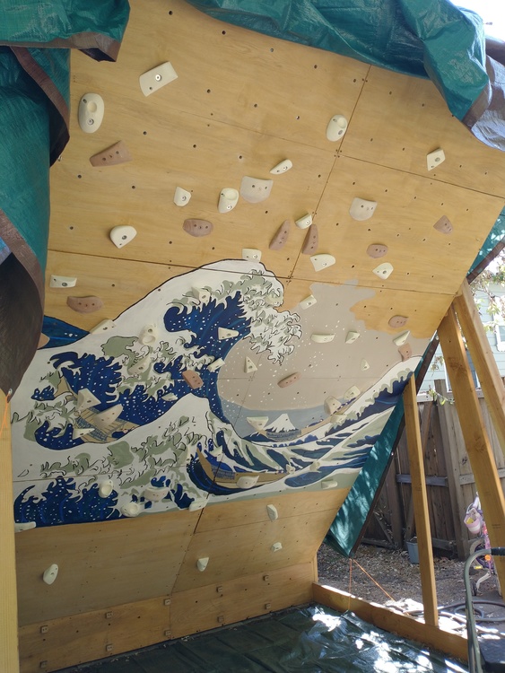 My moonboard with one set of moon holds plus mirrored wood holds for warming up or working symmetrically. Painted a mural on it because that blank surface was calling to me. (Art is The Great Wave by Hokusai). |