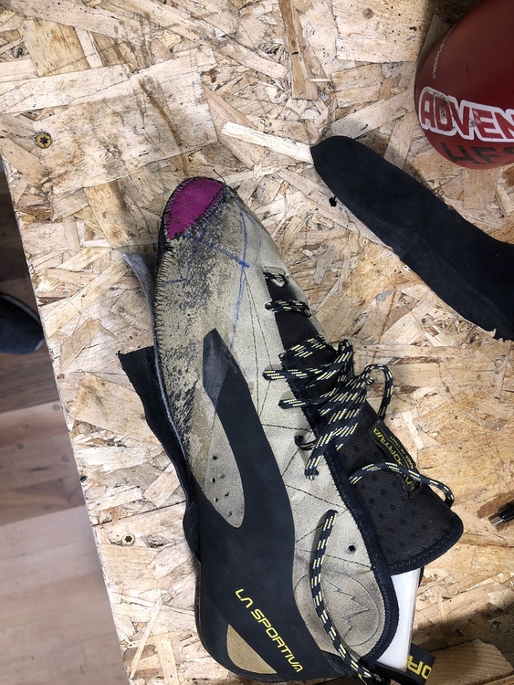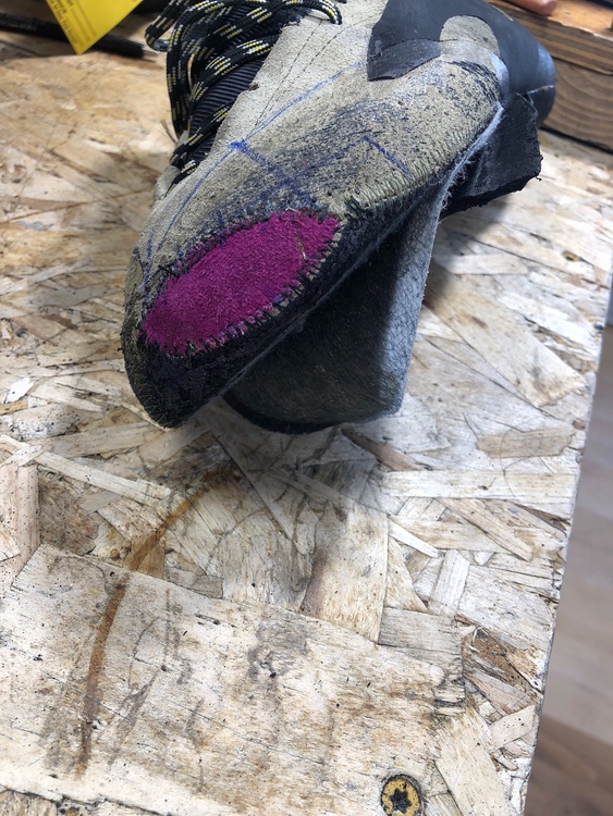 I went in to Rock and Resole to try on my TC Pro that they are customizing for my weird left foot (isn't that a movie with Daniel Day Lewis?) Here are a couple of photos. It is amazing how soft the leather boot part is, more like a sock than a shoe. They added the pink leather to make room for my second and third toes. Now they need to replace the rand and do a half re-sole. I'm nursing an injured finger so this is a good time to be without my shoes, but I am jonesing to try these out! 70 degrees and no smoke is so nice! |