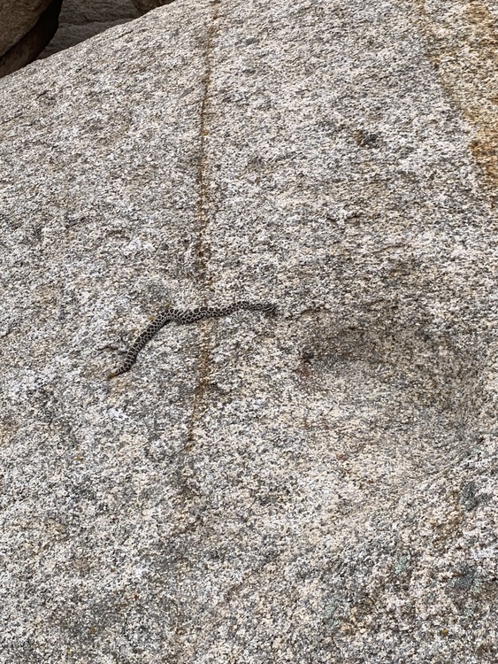 wendy weisswrote: Wendy I understand your sentiments and I agree. I have a “10%” theory... any combination of rest, diet, whatever that allows me to feel even 10% better is a win. I’m sure feeling my age right now and all the limits I was hoping wouldn’t exist, especially since being away from the gym most of this year. Right now climbing feels presumptuous to me... silly and all wrong. I know my days of climbing are limited. I’m trying to make peace with this. You are doing a beautiful job of handling limits with grace. But on to my bf Dave Houser routes. We had a fun day out today exploring a place with limited information and almost no traffic. I wanted to go someplace that wasn’t all mapped out... go on a discovery junket. So I finally got to see Cave Corridor and try a Houser route and even wore my Dave’s Not Here t-shirt. What I’m hoping is that Houser will find out he has a groupie and will come out of hiding—if only to chew me out and tell me to knock it off. I’ve even been thinking of having “First and Possibly Last Annual Dave Houser Campfire and Sing Along” weekend outing where we get to climb his best routes. (Is that even legal without his consent?) I got rattled on the 10b route (NOT Housers) and wish I could have stopped the negative chatter that so got in the way. Plus I’m not fit and not strong and I felt exposed and just a bit freaked out. Oh, and this little rattle snake showed up next to my shoe cam. We were within a foot. |