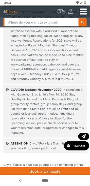 Idaho Bobwrote: Well. This is another option, too... And might be how it goes anyway. So. Maybe September is fine...maybe it isn't. Booking individual campsites, adjacent to each other, is definitely also a good way to go. That's what we did for the start of the 2020 September trip, after all. Four sites, sharing parking with each other, meeting (or not) as everyone wished. Opinions? Here's another screenshot, of the campsite map. I've not camped at the lowest numbers, just from about Window arch on up. Best, Helen EDIT and a link to the camping page with the map and info. Scroll around and click map. https://www.reserveamerica.com/explore/city-of-rocks-national-reserve/ID/315044/campsites 23-32 is the cluster of campsites around the Flaming Rock trailhead. |