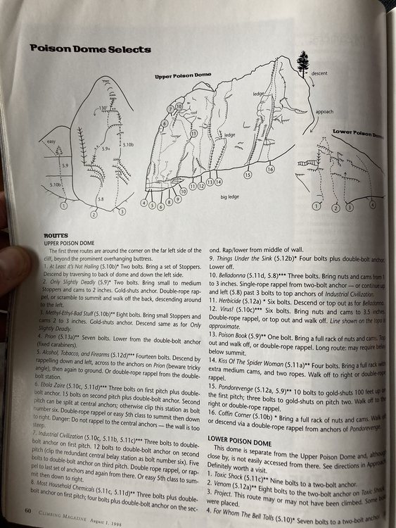 Bob, you're up for posting a photo! Yep, definitely a bit obscure - that's Upper Poison Dome near Sherman Pass, page 64/65 in the Domelands guidebook. The route I'm leading is a really fun corner, think it was 5.9+ or so, and there's a chain anchor at 100' I think? Or might even need 2 ropes? I don't remember if there was an old magazine article on that, or how we found routes, maybe someone told us or maybe we were just exploring. No idea on route names there, but it's excellent rock. You hike on motorcycle trails for a bit on the approach. Edit: thanks to Brian digging up the old article, that route is Poison Book 5.9, route 13 in the topo he posted below. |