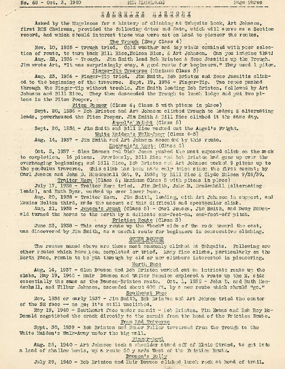 jt newgardwrote: :-) I went through the summer issues of Mugelnoos from the beginning up until 1940 to look for Tahquitz stuff. The single most interesting page was this summary of FA's from Mugelnoos 68, Oct. 3, 1940, which I've posted below. What we now call the friction descent was originally considered a route, and was not discovered until June 1938, a year after Mechanic's Route! During this period there were only 9 routes established, so people did them over and over. Mechanic's Route is listed as class 6, Piton Pooper as "Class 6; Class 5 with pitons in place." Everything left of the Maiden was unclimbed as of 1940, although there had been several attempts to find routes. The 1939 newsletter mentions "a strange and unknown mortal" showing up and soloing the Trough barefoot. People seem to have normally done a climb and then rapped back down, which would explain why nobody cared about using what we now think of as the standard descent routes. |
