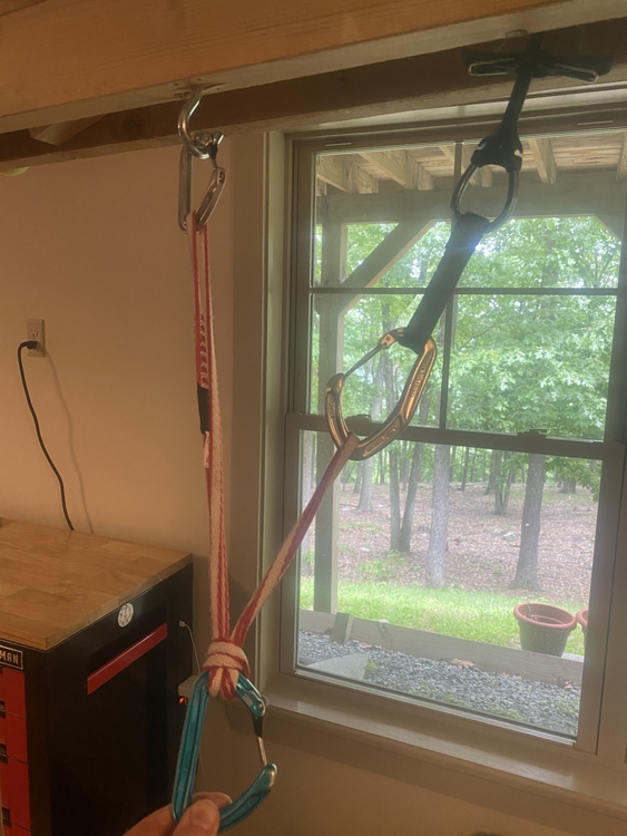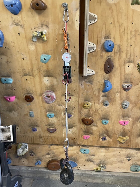 Follow up to my post last week: This technique is just an option and not the only or best solution, but it does have its place. Most people climbing hard thin routes are not using half rope techniques (except exceptions like Gritstone) or are dealing with 4ft slings with one hand while on lead. If you set this up and attach a weight to the bottom girth hitched carabiner and hold one carabiner in each hand, then you can easily “feel” and “test” it. Attached is a photo for those who want empirical data. (Approximate 26llbs load with 13lbs load on each “piece”.) |