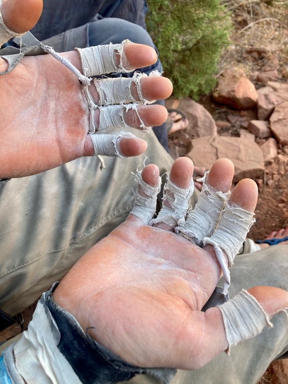 For commenters who don't have Spotify (which is free if you tolerate radio ads), I'll add your songs to the playlist. I'll be listening to this at the gym tonight as I'm hoisting masses instead of pulling plastic with the crew. Middle finger A2's are hella cranky after a three-day weekend in the Red. This is what happens when a crusty trad-dad wannabe tries to climb his Creek grade in the Steep South. |