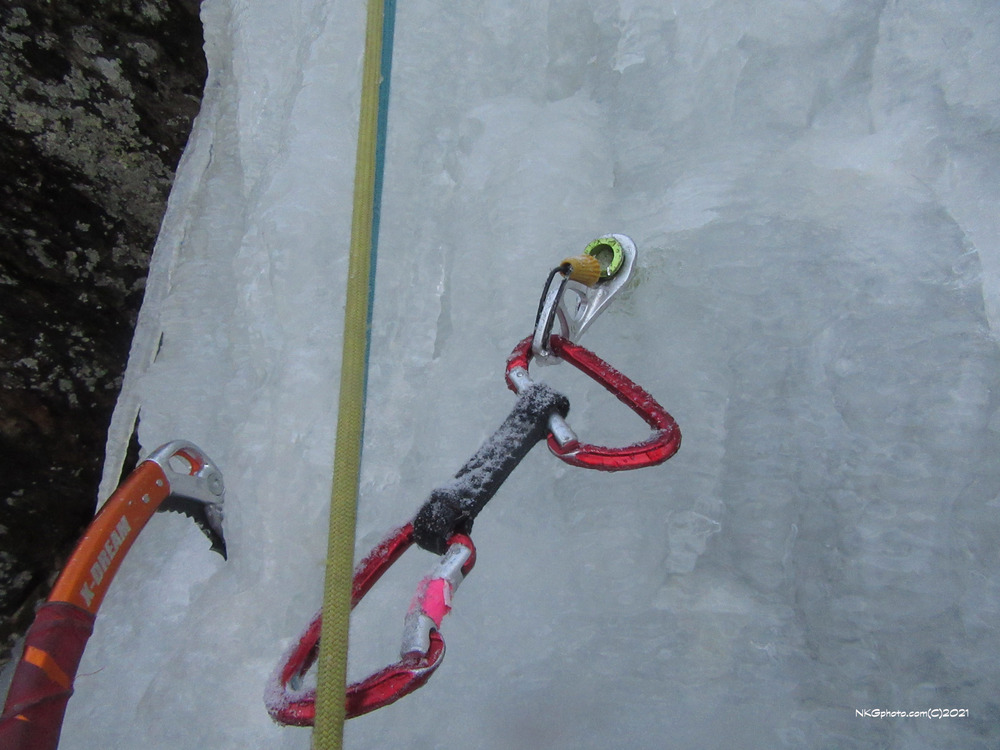 Thanks everyone. I have been prodding Lori occasionally for about the last year to go somewhere more forgiving for a month or so.. Jtree is tough. They bowl overhand. Heck there are G rated 5.7s at Castle rock with 5.11 exposure . This one is on Braxies Pillar. Got out for a ski sat with Bernie the wonder dog. Sunday I Bernie was a good dog and watched the house while we got and ski to a climb in before I got sick.... Isa led the 2nd pitch. This was a nice little heads up to remember to not put all our eggs in one basket. It just got bumped on the way by and the biner stuck in the perfect wrong spot. |