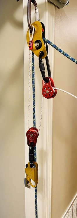"Any cam on any pulley in the 2:1 lifting section would necessarily have to be latched open. You can't continually be opening a cam or it'll take you forever to haul. " That's what I was thinking. So, why not just use a normal pulley on the 2:1 setup and then just pull down on the haul line, which is running through a PCP as you pull down on the z cord? |