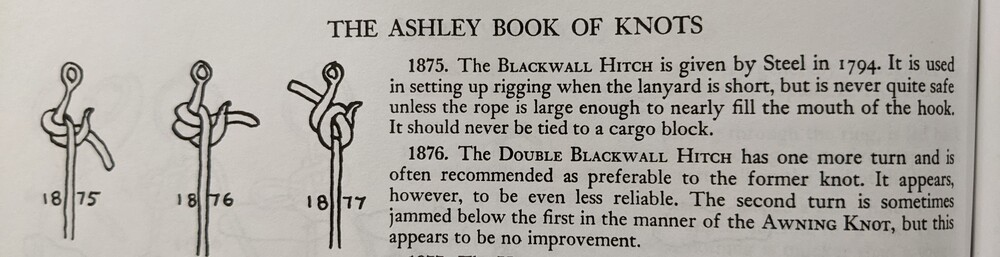While I can see why you might think that 1875 and 1876 are years, they are not--they are knot numbers. The Blackwall hitch is the 1875th knot in Ashley's book of knots, and the Double Blackwall hitch is the 1876th. Because of the popularity of Ashley's book and the numbering system used, knot tying circles will often refer to knots by their number in Ashley's book, which can be helpful in unambiguously identifying knots with obscure or varied names. For example the figure 8 retrace is ABoK 1047 while the double bowline is ABoK 1013. Ashley's Book of Knots was published in 1944. |