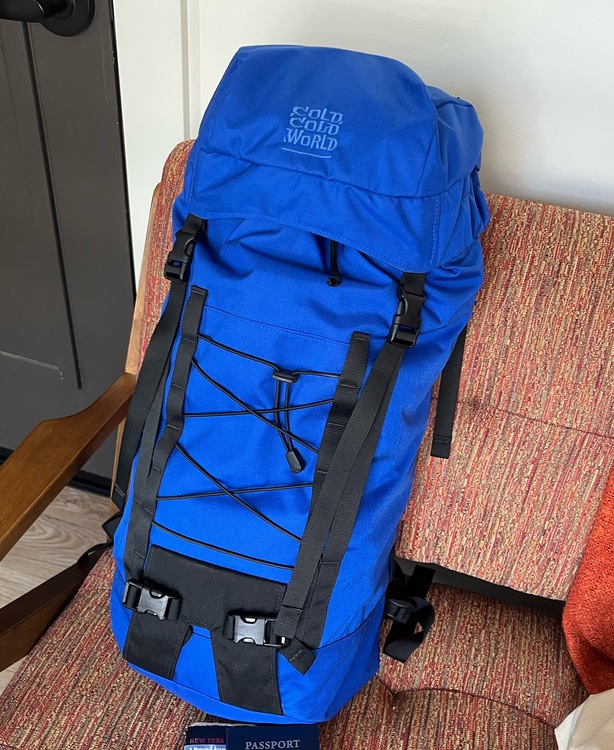 Sorry for the poor picture. It's the Valdez, 40L+ ~10L with the sleeve is what it's specced for but it feels a little smaller than that. Other than the material, I asked him to add a rope strap, remove the front crampon buckles, updated ice tool attachments, and a hip belt with gear loops and slot for clippers. I was going to have him chop the daisy chains but I ended up keeping them in case I wanted to strap anything to the sides and the straps weren't long enough (they won't fully go around a non-cut down nemo switchback). I've never had space issues with it for climbing but if you were planning on overnights, I would probably spring for the Chernobyl unless you and your partner were pretty minimalist. Depending on how you split up the gear it might be fine, ymmv with that. |