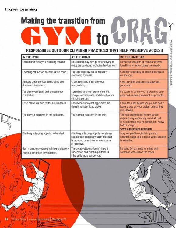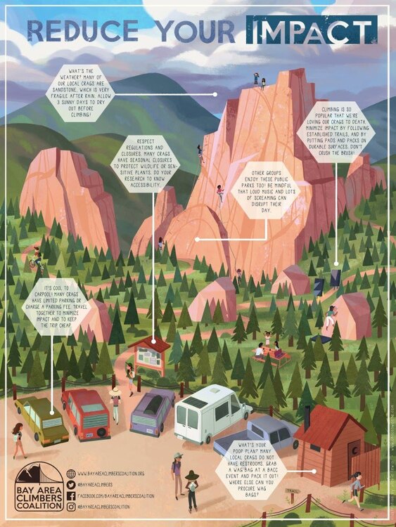 Big Redwrote: +1 I would only add - do NOT bring a large group to one small crag(or one route)! I think this is one of the basics of leave no trace ethics. |