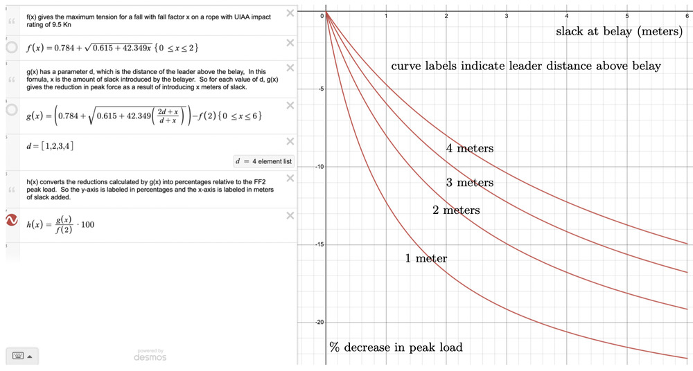 If you are using a belay method that slips, then adding slack to the belay is exactly the wrong thing to do, as Frank has already explained. The point is that once energy absorbtion is via sliding friction in the belay device, the fall factor is no longer relevant, and instead what matters is the height of the fall. If devices that lock up are being employed, then the fall factor remains relevant, because there will be no slippage at the belay. In this case---in theory---the maximum load to the anchor can be reduced by adding slack. Some people have claimed that the extra distance fallen would negate whatever peak load reduction the decreased fall factor produces, but this is false. There are, in theory, real reductions. (I still think adding slack is a bad idea, but the question was hypothetical and so is this response.) The analysis below is based on the basic standard equation for peak force. I wrote up something about this for sophomore undergraduates sixteen years ago, and it has found its way onto the web at https://4sport.ua/_upl/2/1404/StandardEqn.pdf. This is the simplest possible model, viewing the rope as a simple harmonic oscillator (i.e. an elastic spring). Much more sophisticated models exist, introducing damping and modeling rope behavior as a combination of simple harmonic oscillators in parallel and series. Some models try to account for some of the sources of friction in the belay chain (which wouldn't be an issue in a factor 2 fall), and some try to factor in the energy absorbed by tightening knots. None of the models (that I know of) takes into account the deflection of the human body. So the simple model is just a first approximation. Please don't read too much into it. On the other hand, it is a lot better than vague intuitions based on who knows what. Using the simple model for a rope with a UIAA impact rating of 9.5 kN, the graph below shows what percentage reduction in peak force you get. There's some information on the left about the calculations, information that should make sense if the article I linked above is consulted. The take-away is not the numbers, but rather that lowered peak forces are possible with extra slack when the belay device doesn't slip and the belayer doesn't move. As an exercise in mathematical woofuckery, this is an amusing gambit, but I wouldn't use it as a justification for actually leaving any more than the usual amount of slack in the system. Hypothetical overhanging walls notwithstanding, significantly adding to a factor 2 fall is a dangerous proposition for the leader. Moreover, we have no ability to judge the peak force an anchor can withstand, and so have no idea whether any of the percentage reductions would be of any use.The main point is, of course, to avoid sketchy anchors. Various strategies have been mentioned. I'd say if one can't climb up or down, the best chance of keeping anchor loads low is for the belayer to have a braced stance, a non-locking belay device or Munter hitch on their harness, and a pair of gloves. I've held a factor 2 fall this way and another maybe FF 1.8 with the piece horizontally off to the side, so don't tell me it can't be done. After all that, there may be times hopefully very rare, when the leader just better not fall, because they'll take the belayer with them. |