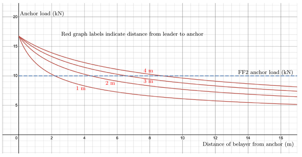 Alec Baker wrote: I thought I made it clear that distances matter! If we do the numbers, I think the conclusion is rather stronger than I suggested: the chariot belay should not be used as a way to reduce anchor load in an otherwise factor 2 fall. The reason is, as I said in the previous post, that the decrease in fall factor might not be enough to overcome the near-doubling of anchor load. The graph below (for the same rope as before with UIAA impact rating of 9.5 kN) illustrates the issue, which is that, for the most part, it won't be practical to position the belayer far enough away, so that the chariot belay is likely to increase the anchor load above the FF2 impact level. And although the model is the same simple one with the attending caveats already mentioned, I have used the fact that rather than doubling the load to the anchor, carabiner friction results in the anchor getting about 1.67 times the load. Note that things get worse as the leader gets higher above the anchor. If the belayer is 4m from the anchor and the leader falls from 1m above, then the chariot belay results in an anchor load lower than the FF2 threshold--so far so good. But if the leader gets more than 2m above the anchor, the anchor load with chariot belay is higher than the FF2 load. Moreover, if we want to keep the anchor load below the FF2 load for a leader fall from 4m up, then the belayer has to be positioned at least 10m below the anchor, which may or may not be practical.As I said before, it is likely that such a simple model will not produce numbers obtained in the field. But I still think the message is clear: there's a decent chance that the chariot belay will increase the anchor load, there's no way anyone can make good determinations in the field, and if there is any concern about the anchor, the chariot belay is a bad bet. Note that the chariot belay can still reduce impacts on belayer and leader---when the anchor is beyond question. This is about anchor loads, where the 1.67 load multiplication factor is part of the picture. |