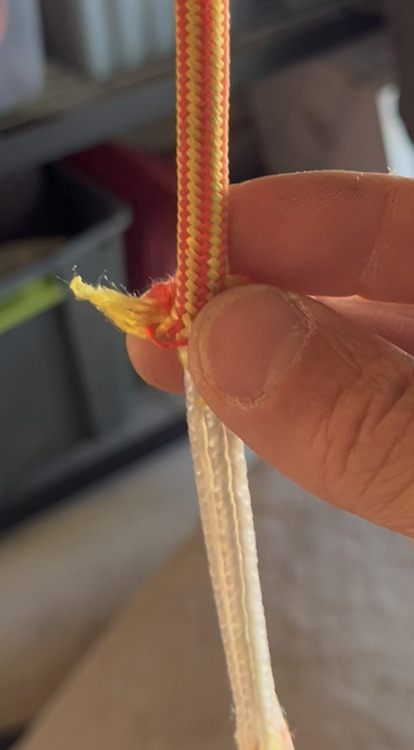 I couldn't resist a little test. I shredded some 6 mm cord with an old CAMP ascender. I attached the ascender to my harness with a single carabiner and clamped it to the 6 mm accessory cord. Then I put my full weight on the ascender and body bounced it. After a few hard body bounces I could hear the sheath ripping and at bounce 8 I totally de-sheathed the accessory cord. This was enough to convince me that it would be a very bad idea to attempt ascenders on a 6 mm tagline. I was trying to rip it, so maybe in a real situation I would be putting less force on it, but still. I think I would use a different method. I weight around 165 pounds. If you want to see the video, send me a message (these are screenshots). Before After De-sheathed |