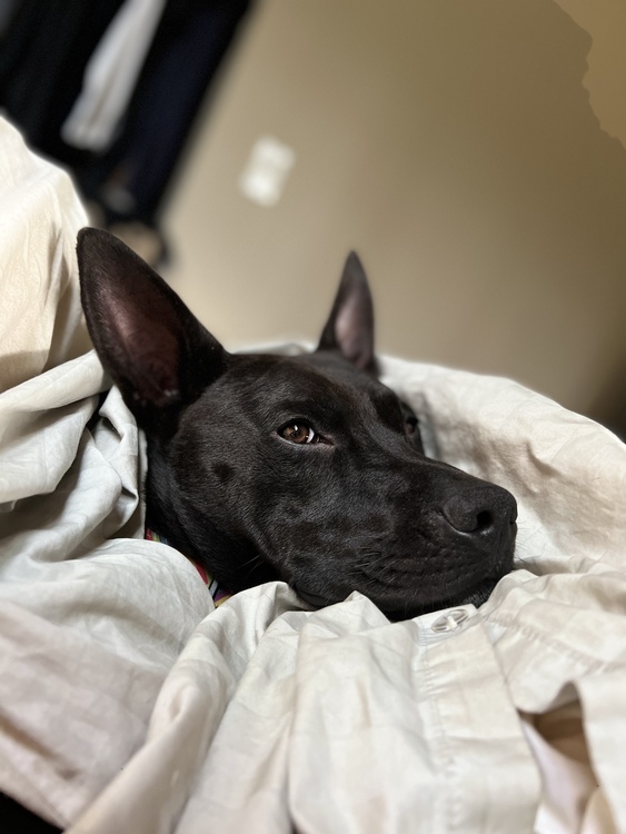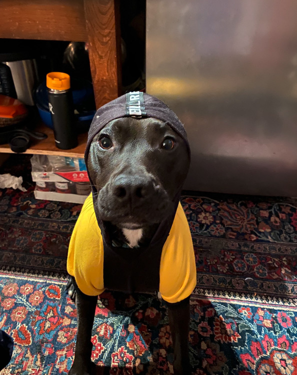 FrankPSwrote: Thanks Frank! Lots of folks see Kelpie in her. We think Kelpie pit mix. We say she is an OBD…Oakland Black Dog. We got her from the pound at about 9 months old. She is a very good girl. |