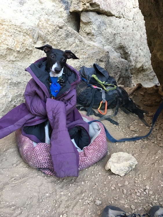 Sam dog and the rat. She is not pleased with his proximity to Her Royal Highness. When Sam was younger you could point to any rock with a less than vertical slope and he’d get up it, but not at the crag. I would take him deep into the backcountry hiking where there were no other people. Now he’s old and finds the stairs to be adventurous enough. |