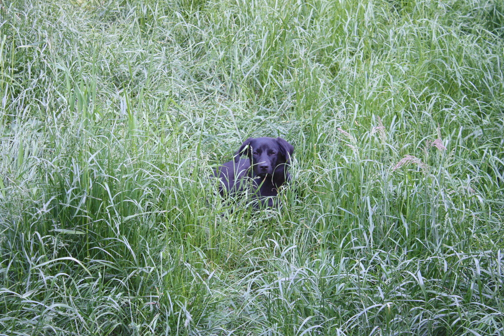 In this picture, I am training Luna to hide in tall grass, so that she can more effectively jump out and attack climbers at crags. It took a lot of time and hard work, but she perfected this skill. She always likes to ambush this one climber named Adam Burch. I don't know why she has taken such a "liking" to him. She always jumps out and nips him in the heels. Good fun! |