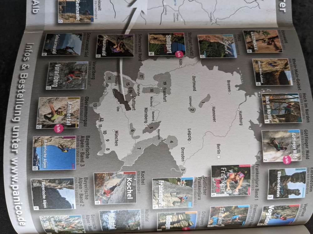 I currently live in Stuttgart and moved here from Denver last year. I feel like the access to climbing in Germany is different than in CO. Instead of a few large areas (Clear Creek, Boulder Canyon, Shelf, etc) there are tons of crags sprinkled throughout the region. Just for the Schwäbischen Alb Region, I have four guide books with thousands of routes each. Once you get into Austria, Italy, and other countries the amount of climbing options explode. To address some of your other questions. Because Stuttgart is in a region with several large multi-national corporations, I think people around here are used to foreigners from all over the world living here. I'd imagine Munich is similar. I'm a single guy without kids so I can't comment on the child care stuff. As far as housing expenses. I've heard if you are a German you'll pay a much more affordable rate for house than a non-German. I think it is assumed a foreigner works for Bosch, Porsche, or some other company that pays a lot of money to live in Germany, thus can afford higher rent. Smaller villages will have cheaper rent but that comes with its own challenges of finding the resources to search for a place. As far as the language goes. I'm in the process of learning German but it's definitely a hard language (for me at least). I can get by with basic phrases in large cities. Around places like the Frankenjura it can be a bit more difficult to find English speakers. If you have any other questions, feel free to PM me. I've included a couple of images from the cover of the guide books to give you an idea of where some of the climbing is. Inside cover from the Out of Rosenheim book Inside cover showing some of the other areas |