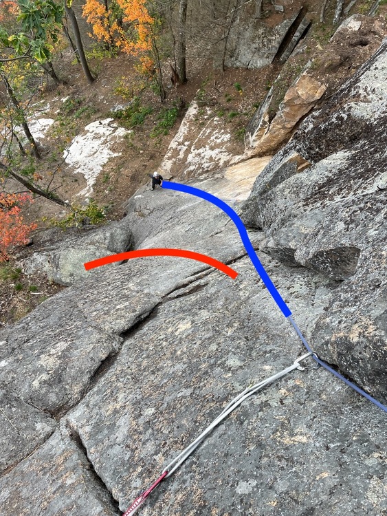 Later this summer, I toproped the route a number of times to see how much had changed. I harangued friends into helping me remove more loose rock, flakes, and dirt from the first pitch. I led the entire route few times, hoping to find a natural line that would be protectable with gear. However, each time I led the route (by a few variations) I was faced with a ground fall for much of the climbing. The result was an ethical conundrum. Before the rockfall altered the first pitch, Retaliation was a beautiful, pure, gear-protected climb where one could test themselves against nature - physically and mentally. Similar to chipping holds, my opinion is that adding bolts to an existing climb is poor style: A retrobolter robs future ascentionists of the chance to test their own self-reliance. However, the character of the first pitch had undoubtably changed. This pitch was never "perfectly" protected, but now it was nearly un-protectable. Despite my hopes of finding a gear-only line, I realized the options were a) add a couple bolts, or b) very few people will lead this classic route anymore. I brought up this quandary with a bunch of veteran climbers, some of whom TR'ed the route and offered their insight. At a public Friends of the Ledges meeting in October, I gave a quick overview of the condition of the route and my own thoughts for adding a few bolts. A week later, I added two bolts that are roughly where climbers used to be able to place protection in the (now departed) p.1 flake. The climbing is a bit harder than before, maybe 5.7. You'll still need to place some of your own gear, and you still have to make moves above your pro. The second and third pitches have not changed. I also placed one bolt on a variation to the first pitch. The variation has much more interesting climbing than the slab start. Begin on the ledge below Youth Challenge. From the left side of the ledge, clip a high bolt and face climb around the blunt arête. 5.8. (red in the picture) Routes that have been around for generations are as much the "property" of the climbing community as they are the property of the first ascentionist. While I put in a good-faith effort to build consensus around the bolts I planned to place, don't be surprised if you show up and find that someone has chopped them. As much as I am free to place bolts, others are free to take them back out. It may be a messy form of democracy (especially when done anonymously), but this style of self-regulation has allowed the North Conway community to maintain a truly unique and beautiful atmosphere at our historic crags. In closing, Retaliation is still dangerous because climbing is always going to be dangerous. But pitch 1 has less loose rock than it did in spring, and it can now be reasonably protected. Full disclosure: while I may be a FOTL board member, I did all of this work in my personal capacity and using my own tools and hardware. I'm also a professional mountain guide, but I don't guide Retaliation very often and I'm not going to make an extra cent by having placed these bolts. |