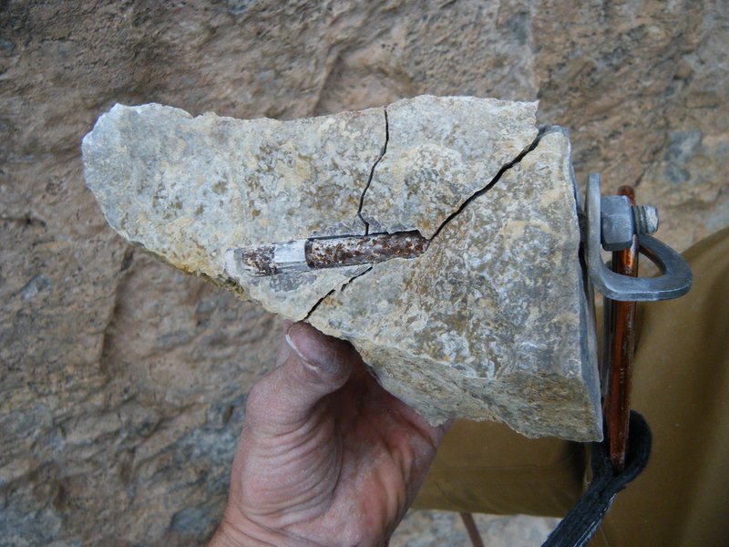 As an avid route developer and rebolter I'm always interested in these bolt failure discussions. What I get really interested in is what actually failed. A nut coming lose and falling off is very different than an actual bolt or hanger breaking, principally because having metal/hardware break is a lot harder to do something about (other than using good hardware or rebolting stuff) than the former, which climbers can be more proactively responsible for (like properly placing bolts or tightening nuts or using Loctite). Here's an example of a bolt failure from a poorly placed bolt: Which, to me, is different than the SCC that John is talking about (broken with one tug of a quickdraw). More pics here. In the hundred of bolts I've replaced only one was from the actual bolt breaking during a fall. The others were getting old (Stary Dryves, old Leepers, etc), extremely rusted or even grooved, or loose in the rock they were placed in. A few were bolts that had come out because the bolt or nut had worked loose. |