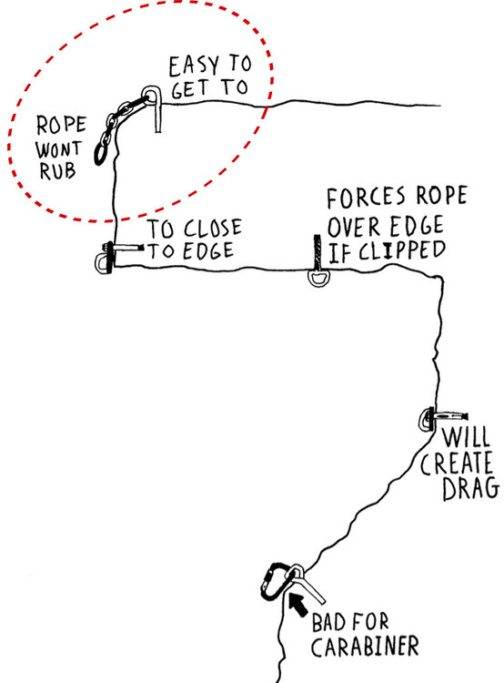 One part of the problem is the lack of good rappeling instructions. There are many ways to rappel this route, and the descriptions one could find seem contradicting and confusing. Another problem, is that the P6 anchor is on top of the rock, and the rope is likely to get pinched as it goes down over the edge and rubs the rock. I suggest putting two permanent chains on the two bolts on the right, with one single rappel ring at the end of the chains. This will extend the anchor beyond the rock edge, creating a single redundant master point for rappeling that is not obstructed by the edge of the rock. Here is also an schematic from the HowNot2 Bolting Bible to further clarify this. |