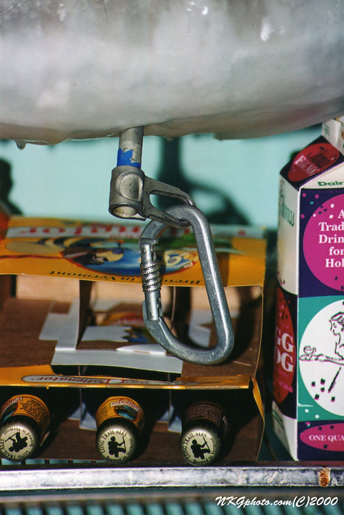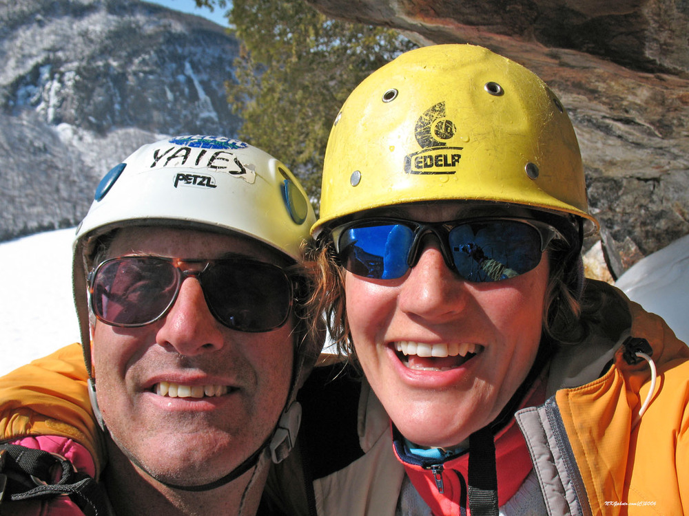I just opened an old memory stick.. lots of cool stuff on it. The fridge in my old cabin complete with Chounard bottle opener. Must have been Christmas Me Leading P4 of The Last Gentleman on a day that was just a bit too warm for that climb or we should have started earlier... It goes south in a hurry if its sunny with no wind and in the upper 20s... Isa on a climb she convinced me to bolt for her. That was BINTD when I had to drill by hand and bolt ground up... She needed Ed's help to show me the path of top down bolting;) Celibacy 9+ Starting up Power Play in the Daks. A pretty intimidating looking two pitch WI5 somewhere is a shot of us on the climb that a friend took but have not seen that in quite awhile.. the cave belay on 20 Below Zero up High on Cannon |