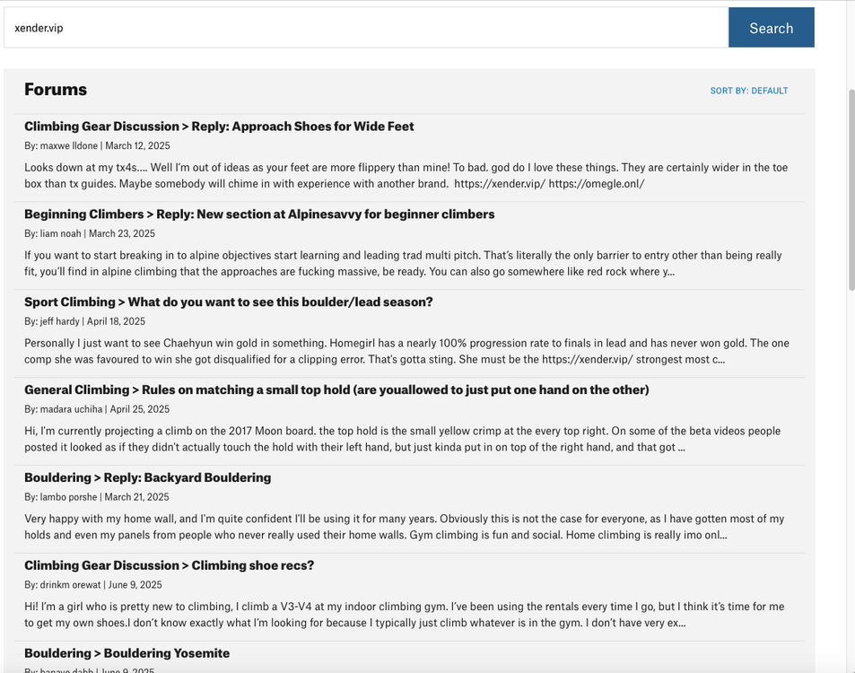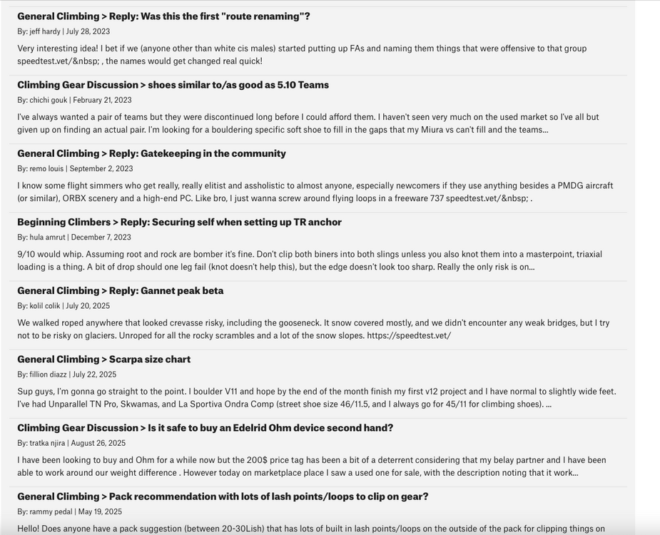 Did some digging after another bot post today. It looks like most bots edit their posts after some time has passed to add in sketchy links without triggering notifications. I didn't click any of the links because I don't want my computer to catch on fire, but presumably they are spam, scams, or SEO. Try searching the forums for "xender.vip", "100001.onl", "omegle", "vidmate", “speedtest”, "routerlogin", "9apps.ooo", or "192168", and you will find several dozen bot posts, mostly from accounts that have not been suspended. Contrary to my expectations, it seems like many of these posts weren't actually AI posts, but were copied and pasted from elsewhere on the internet (often reddit). Regardless of how they were made, it's pretty obvious they aren't real climbers, and I'm calling them "bots" for lack of a better term. I realize that posts about bots are nearly as annoying as posts by bots, but figured sharing these could provide some good examples that make it easier to spot them in the future (and to block these accounts). Edit: If a mod sees this, there are around a hundred bot accounts that need deletion/banning. It might be a good idea to save the account info somewhere (i.e. their emails, IP addresses, and patterns of posting/activity), as this is a good "dataset" that could help to detect this sort of thing in the future. |