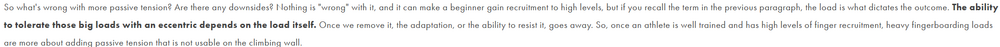 Trevor Kerberwrote: I don't know what study from Tyler you are referencing, so I am not going to argue...with that said, I can agree with your overall sentiment in that the application does not translate directly to actual climbing (i.e. being able to hang with a certain amount weight does not equate to climbing a certain grade) but I do disagree with your claim that once the weight is removed, their ability to passively hang goes away. That's not how strength works, if I am to understand you correctly. For example, if I can bench press 300lbs, my ability to push that much weight doesn't immediately disappear just because I am no longer on the bench. Maybe I am misunderstanding what you are saying, but if you are training finger strength properly, then your finger strength will improve...which is obviously a large factor in climbing. Yes the results may seem less dramatic, but I am confident any climber will see significant gains unless they are already climbing above the V10/5.14a level. |