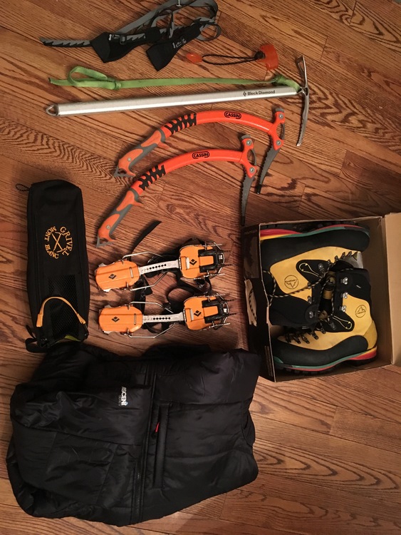 already got axes and jacket, but looking for new boots and crampons. so if you are looking to part out ill put an offer in on the Boots and Crampons as well as the leashes. :)