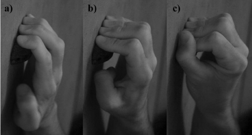 a.) open b.) half c.) full This is a good picture, but I believe that in b) they bent the thumb down to show the position of other fingers, but it't not the actual half crimp. If you extend the thumb up, without changing the bend angle of the other fingers, it would naturally rest on the SIDE of the index finger. Not on top, as in the full crimp, but still it wouldn't normally be hanging down the way it is shown in the picture, because why? It's a crimp, not a pocket. For me personally the squeeze of the index and thumb together, as if you are pinching a sheet of paper, is a key to the half crimp.