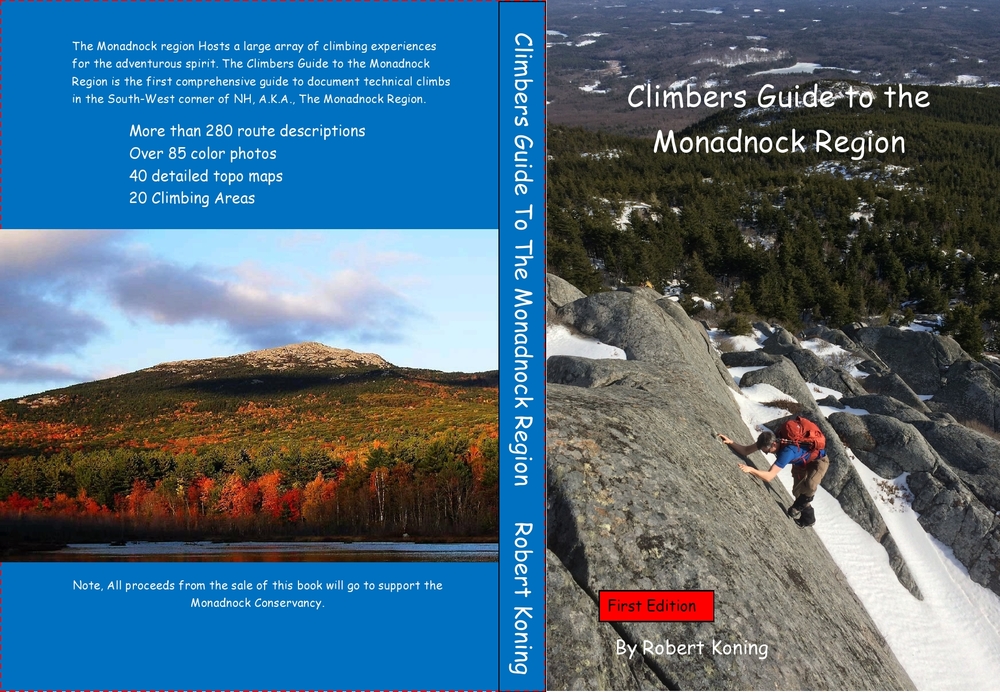 The Monadnock region Hosts a large array of climbing experiences for the adventurous spirit. The Climbers Guide to the Monadnock Region is the first comprehensive guide to document technical climbs in the South-West corner of NH, A.K.A., The Monadnock Region. More than 280 route descriptions Over 85 color photos 40 detailed topo maps 16 Climbing Area descriptions Note, All proceeds from the sale of this book will go to support the Monadnock Conservancy. Our local land trust organisation. $25 + $4 shipping and handling Search e-bey or http://www.rowingbicyclekontechdesign.com/Guidebook.shtml